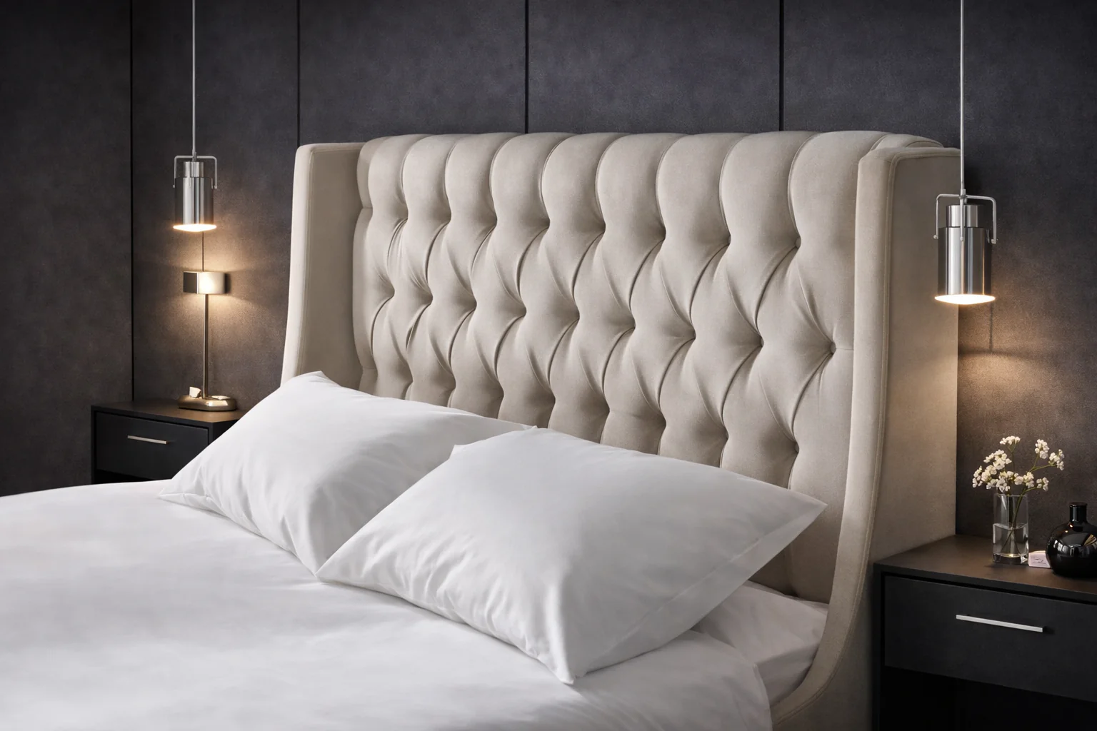 The Florence buttoned bed is designed with gracefully inclined wings that flow from the ground, creating a sense of intimacy and elegance.