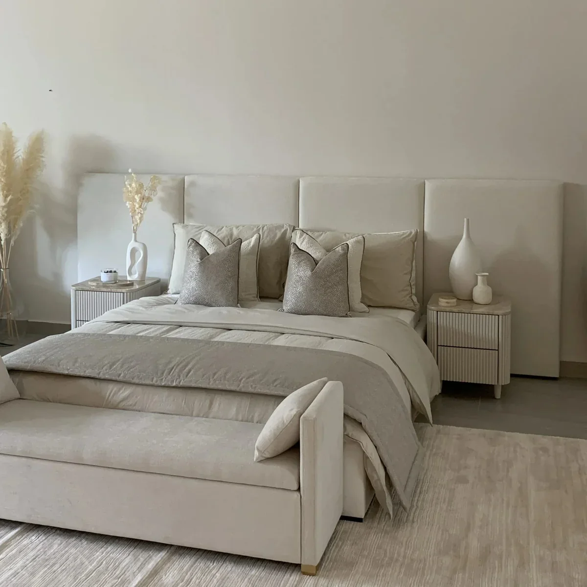Bed is a standout piece in any bedroom it resides. The headboard's sun ray design is minimal yet luxurious touch. The side rails are raised to aligns perfectly with the footend, padded and upholstered in matching fabric.