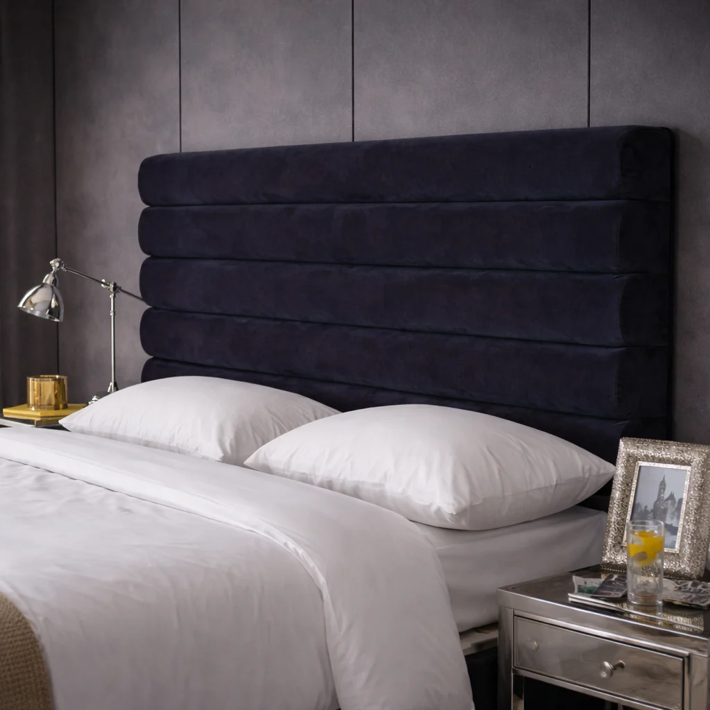 The Valencia bed features a fluted bedstead with a sleek, understated headboard, showcasing diagonal stitching that leads to overlapping fluted panels – the centerpiece of the design.